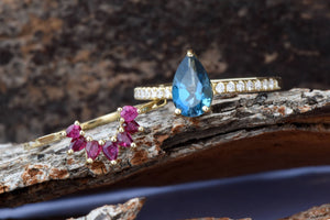 London blue topaz pear cut ring yellow gold-Bridal set rings yellow gold-London blue topaz engagement ring-Promised ring-Cluster wedding set-Ruby Ring